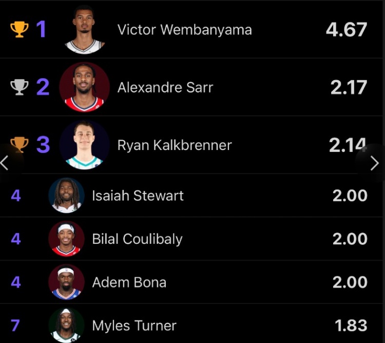 Tính đến thời điểm hiện tại của mùa giải này, Wenban Yama đã chơi 6 lần và tung ra tổng cộng 28 khối, trung bình 4,7 khối mỗi trận. Cả hai số liệu thống kê chặn này đều dẫn đầu giải đấu.