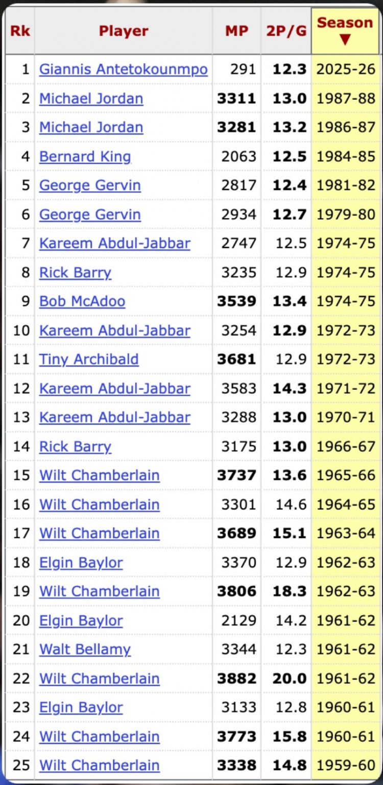 Antetokounmpo ghi trung bình 12,3 quả hai điểm mỗi trận ở mùa giải này, xuất hiện 25 lần trong lịch sử, 19 lần trước khi đường ba điểm được đưa vào sử dụng.
