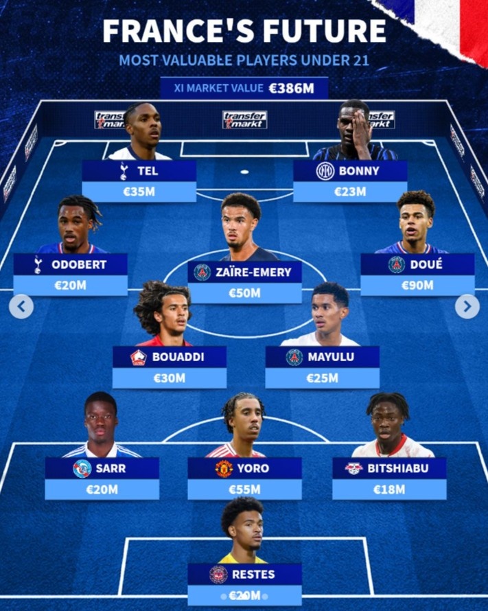 Dezhuan liệt kê đội hình U21 đắt giá nhất của Pháp, Douai có giá cao nhất là 90 triệu euro, Yoro, Bony và Ter cũng được liệt kê và tổng giá trị của đội là 386 triệu euro.