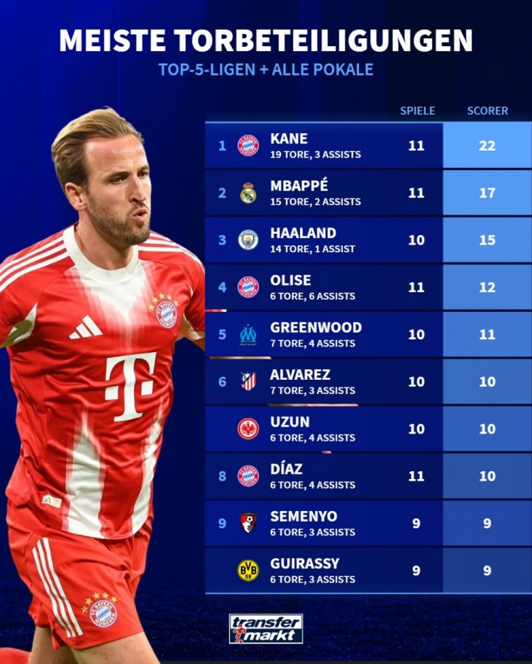 "Thị trường chuyển nhượng" tính tổng số bàn thắng được ghi trực tiếp bởi các cầu thủ từ năm giải đấu lớn trong các sự kiện khác nhau của câu lạc bộ trong mùa giải này. Kane, Mbappe và Haaland xếp trong top 3.